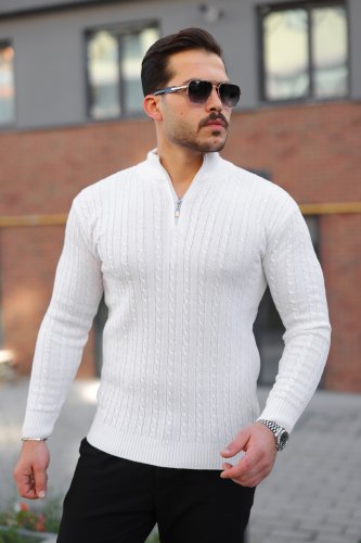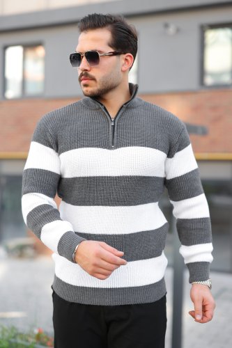 Erkek Şerit Renk Desenli Zip Yaka Kazak