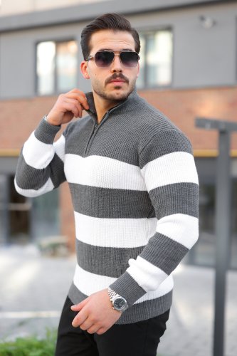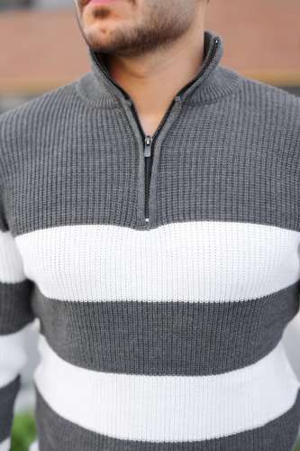Erkek Şerit Renk Desenli Zip Yaka Kazak