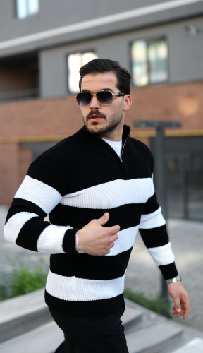 Erkek Şerit Renk Desenli Zip Yaka Kazak