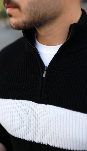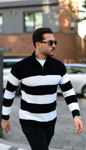 • Erkek Şerit Renk Desenli Zip Yaka Kazak